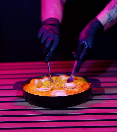 Patatas naturales con mozzarella gratinada, crema de pistacho, pistachos troceados y crujiente topping de bacon.